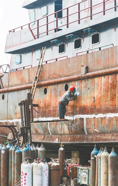 然而,随着国家对船舶安全、技术等方面要求不断提高,手工建造的大型木船逐渐淡出了人们的视线,钢质船成为主流产品。如今,张明的船厂已不再建造木船,但由于割舍不下对船的热爱,他依然从事着与船相关的工作。从2014年开始,他和儿子承接拆船业务。