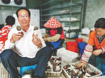 符国华(左)在保鲜库里筛检红托竹荪并打包。本报记者 曾毓慧 摄