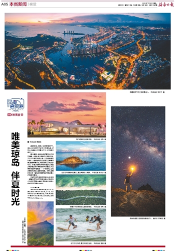 晨光熹微,海南岛被喷薄而出的旭日唤醒。你瞧,海口湾畔的云洞图书馆、万宁日月湾的旅游公路、三亚海棠湾的沙滩……海南各地的天空被万丈朝霞写满;随着朝霞淡去,艳阳高照,大地光彩夺目。你看,海南热带雨林国家公园里万物欢腾,棋子湾畔游客快乐嬉戏,木兰湾畔孩童幸福踏浪……夕阳西沉,金色余晖热烈奔放,浪漫而唯美。你赏,鱼鳞洲旁,那一幅色彩斑斓的画作描绘着人们的夏日喜悦……