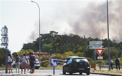 7月16日,在法国拉泰斯特德比什,人们望向因高温引发火灾的地方。 新华社/法新