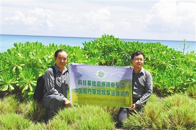 刘国道(左)和杨虎彪在三沙考察牧草资源。