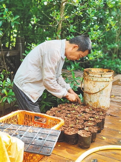王式军育苗十分注重细节。比如繁育红榄李幼苗的土壤,是他混合了土壤、肥料、细沙的特制品,这种“量身定制”的土壤较为疏松,能让幼苗根系畅快“呼吸”,同时为幼苗提供充足的营养。