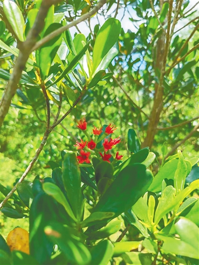 目前,王式军已培育出2000多株红榄李苗。到了花期,红色的红榄李花成为海边迷人的点缀。
