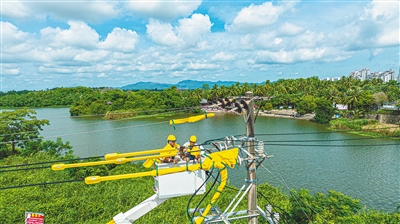 7月19日,在琼海市嘉积镇,南方电网海南琼海供电局带电作业人员穿着厚重的绝缘服高空作业。
