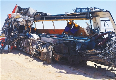 这是7月19日在埃及南部明亚省沙漠公路上拍摄的交通事故中的大巴残骸。