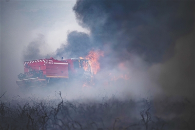 7月19日,在法国西部的阿雷山,野火点燃一辆消防车。新华社/法新