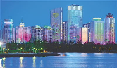 7月20日,随着消博会临近,海口城市主题宣传氛围浓厚。夜幕降临,消博会主题城市灯光秀在海口湾上演。本报记者 封烁 摄