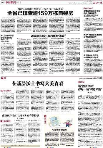 全省全面开展自建房安全隐患排查,线长面广,任务繁重,我省广泛发动社会群众参与自建房安全专项整治行动。各市县发动建筑设计及土木工程类专业的大学生参与自建房安全专项整治行动,共522名大学生志愿者积极参与。屯昌县向社会发布《关于公开房屋建筑违法改建、扩建、加建等问题投诉举报方式的公告》,增加社会知晓度,增加排查线索渠道。省民政厅、省消防安全委员会等部门也印发相关工作方案、相关工作通知,指导做好自建房风险隐患排查等工作。省自然资源和规划厅部署依法依规用地和地质灾害风险排查工作,强化安全管控。
