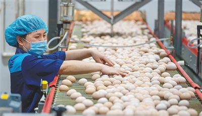 位于澄迈县福山镇的海南农垦300万只蛋鸡全产业链项目蛋品分拣中心,工作人员在挑选鸡蛋。本报记者 袁琛 摄