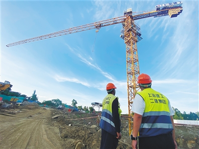 华东师范大学澄迈实验中学二期项目施工现场,工作人员正在检查塔吊。 本报记者 高懿 摄