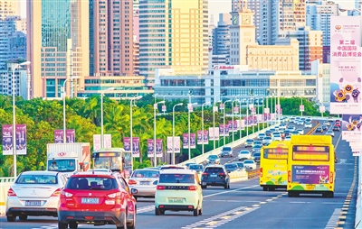 随着消博会临近,海口城市主题宣传氛围浓厚。在海口世纪大桥,沿路两侧挂起道旗,营造浓厚氛围。