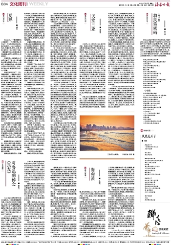 海岛风味,滨海小城,海甸溪川流不息,暮色里,椰林寂寂,树影婆娑,夕日欲颓,彩霞染红江面,渔舟唱晚,偶有飞鸟掠过……光影流转,夜幕降临,隔岸万家灯火通明,波光闪烁,沿着河堤漫步,灯影迷离,常有张若虚《春江花月夜》之感。