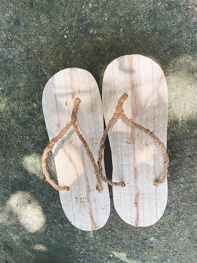 “竹杖芒鞋轻胜马,谁怕?一蓑烟雨任平生。”眼前的东坡鞋有点类似现在的人字拖。只是,鞋底是用木头做的,固定鞋面或用结实的绳子,或用干了的椰子果皮。
