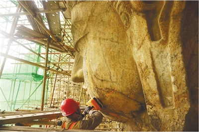 考古人员对龙门石窟奉先寺卢舍那大佛面部进行检测。 本版图片除署名外为资料图