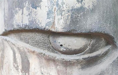 此外,研究人员还发现卢舍那大佛右侧的胁侍普贤菩萨造像眼珠为琉璃所制。造像使用琉璃眼珠,这在龙门石窟还是首次发现。“清理后可以看出,琉璃颜色呈暗绿色,质地均匀,熠熠闪光。”龙门石窟研究院石窟保护研究中心主任马朝龙接受媒体采访时表示,奉先寺造像保存大块片状唐代琉璃实物,实属罕见。