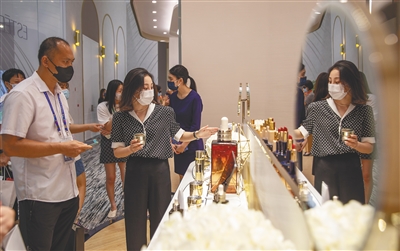 在悠香伊展区,该品牌发布新品悠香伊乳木果沐浴油,如果你已经忙碌了一天,那么试试这款沐浴油,看看肌肤是否也得到休息。“我们一直追求环保和可持续发展,产品沿用100%可降解,纯天然成分。”该品牌展区相关工作人员向海南日报记者介绍。(本报海口7月27日讯)