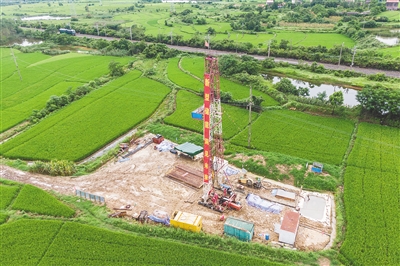 7月26日,中国能建与国家电网共同投资的我国首台(套)300兆瓦级压缩空气储能示范工程,在湖北省应城市举行开工仪式。预计工程建成后年发电量可达5亿千瓦时。图为工人在施工工地深层取芯,勘探地下地质条件。新华社发