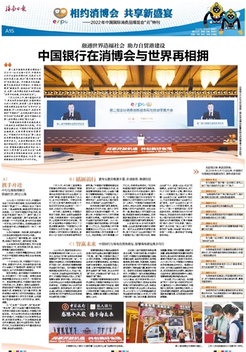 “消费创新和消费升级都是满足人民美好生活需要的伟大实践。作为国有金融企业,中国银行将通过优质金融服务,支持消费创新和消费升级。”中国银行行长刘金在“第二届全球消费创新暨免税与旅游零售大会”致辞中表示。本届消博会期间,中国银行将组织《人民币国际化白皮书》宣介会、智慧海南建设成果发布会、私人银行15周年暨“企业家办公室”品牌发布会等多项特色配套活动,共同打造精彩纷呈的消博盛会,与各界一道助推海南自贸港高水平对外开放。