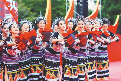7月28日,2022年(首届)保亭红毛丹文化节启动仪式在保亭七仙广场举行。图为现场富有少数民族特色的舞蹈表演。 见习记者 王程龙 摄