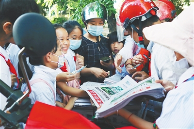 昌江小学生参与社会实践,卖报纸。