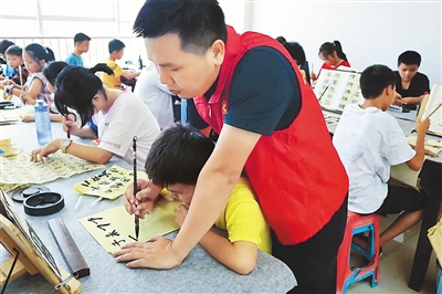 在昌江新时代文明实践中心书法课上,书法老师指导学生练习书法。
