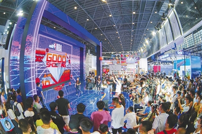 7月29日,在消博会1号馆NBA主题展馆,展区内的投篮挑战吸引观展游客踊跃参与。 本报记者 封烁 摄