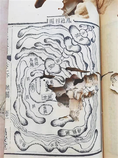 清代光绪三十二年(1906年)撰修的《利氏族谱》中的《凤池村图》,详细画出清代定安龙湖镇凤池村的山岭、田地、池塘等位置及它们的旧称。陈光润 摄