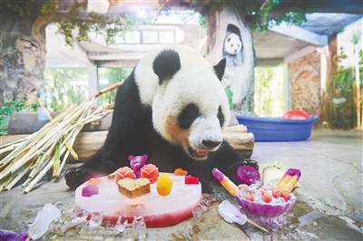 盛夏时节的海南气温炎热、暑气正浓。近日,在海南野生动植物园,大熊猫“舜舜”准备享用饲养员为它制作的解暑“清凉餐”,这顿“大餐”包括提前冻好、造型各异的水果冰及它平日最喜欢吃的窝窝头。