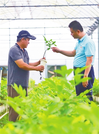 海南省农垦科学院研究员崔志富(右)和同事讨论研究红毛丹种苗培育技术。 见习记者 王程龙 摄