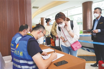 8月10日,在三亚·亚特兰蒂斯,志愿者在核对旅客信息。本报记者 武威 摄