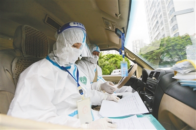 日前,在三亚市天涯区海坡社区,湖南省援琼医疗队的医护人员在车内核对防疫信息。
