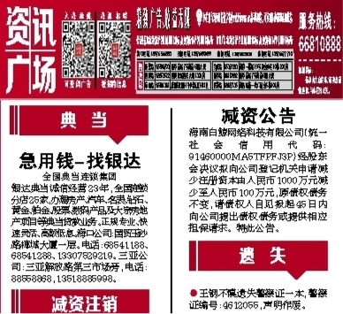 海南白鲸网络科技有限公司(统一社会信用代码:91460000MA5TFPFJ3P)经股东会决议拟向公司登记机关申请减少注册资本由人民币1000万元减少至人民币100万元,原债权债务不变,请债权人自见报起45日内向公司提出债权债务或提供相应担保请求。特此公告。