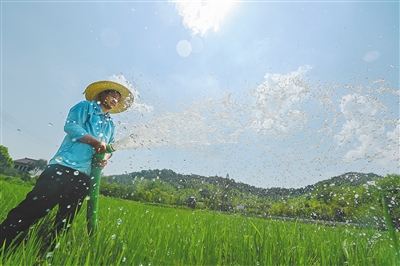 日前,一位农民在浙江湖州市的水稻种植基地里灌水,保证稻田里灌水量大于蒸发量。新华社记者 徐昱 摄