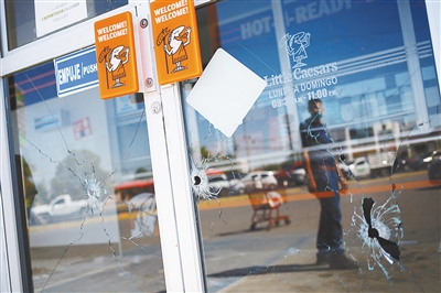 这是8月12日在墨西哥华雷斯拍摄的一家餐厅玻璃门上的弹孔。