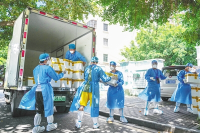 八月二十一日,在三亚市吉阳区荔枝沟社区,志愿者在搬运生活物资。本报记者 武威 摄