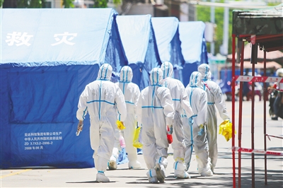 八月二十一日,在三亚红旗街社区,一群“大白”动身前往工作岗位。见习记者 王程龙 摄