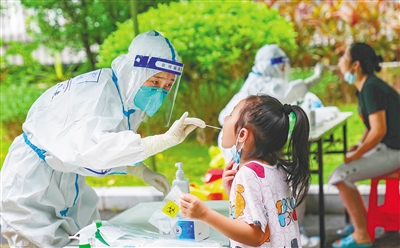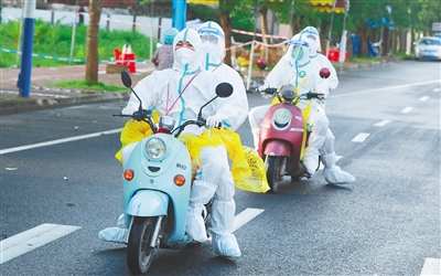 ②8月21日清晨,万宁市万城镇,医务人员骑电动车前往交通不便的地方开展核酸检测。通讯员 杨师忠 摄