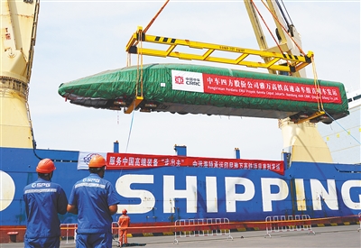 雅万高铁高速动车组在山东港口青岛港装船。