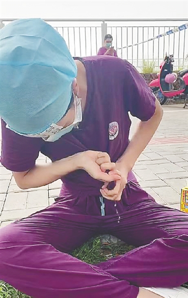 医护人员被汗水浸皱的手。海南省人民医院供图
