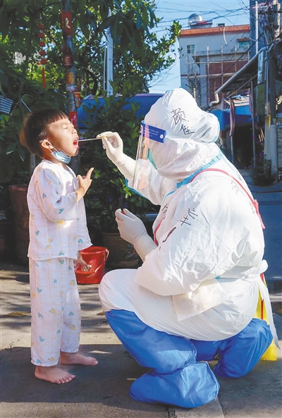 一位医务人员给小男孩做核酸采样。罗韬 摄