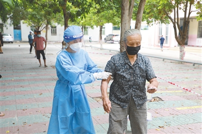 8月17日,乐东九所镇中心学校核酸采样点,医护人员协助行动不便的市民进行核酸采样。 海南日报记者 韦茂金 摄