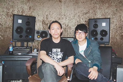 水鸿(右)和音乐人朋友交流音乐制作后合影。