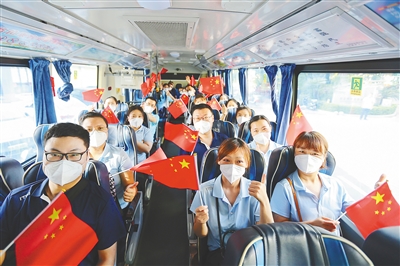 8月29日,在三亚银泰阳光度假酒店,陕西援琼医疗队队员坐上专车准备前往机场。见习记者 王程龙 摄