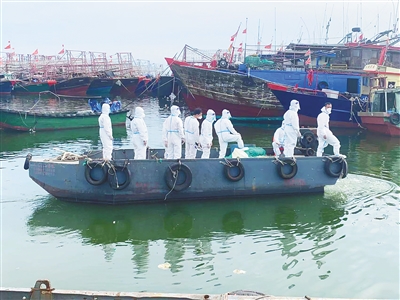 针对全镇27家海水网箱养殖户共约300口海水网箱无法及时投喂的问题,则采取了另一种人力措施:为减少人员流动,避免交叉感染风险,从27家养殖户中选出4位代表成立一个投料互助小组,安排一艘渔船专职负责所有海水网箱饵料投放工作,小组成员吃住在船上,封闭管理。