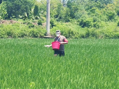 临高县新盈镇农业纾困解难工作组组织志愿者,为村民的农田施肥。