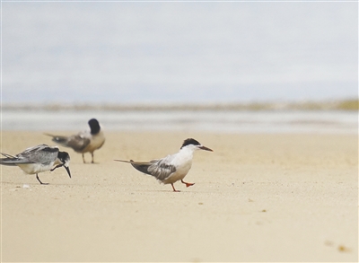 “我曾经在新疆拍到过普通燕鸥,没想到在这里也能拍到,一共有14只。它们与五六十只白额燕鸥在一起,很显眼,体型比白额燕鸥大不少。”公园管理中心副主任薛美丽说。