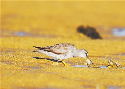 在这片区域,众人还发现了灰尾漂鹬的身影,共有4只,都在啄食水中的小螃蟹。“这些水鸟属于迁徙的候鸟。8月,候鸟大迁徙的序幕将陆续拉开,这个季节,湿地的水草肥美,小鱼、小虾也非常多,候鸟一般在此停留到来年的四、五月才离开。”薛美丽介绍。