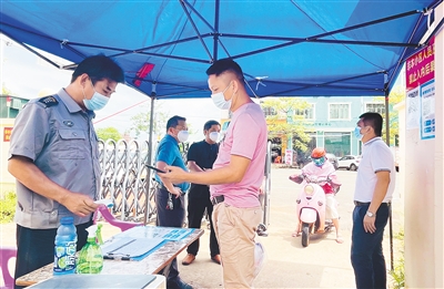 临高县临城镇大坡小区入口处,安保人员正在查验进出人员的健康码、行程码等信息。 (图片均由临高县融媒体中心供图)