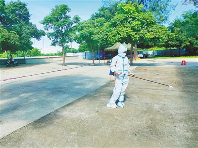 工作人员正在对临高调楼镇隆道村进行消杀。