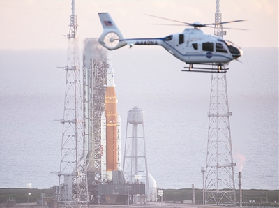 8月29日,在美国佛罗里达州肯尼迪航天中心,一架直升机从新一代登月火箭“太空发射系统”旁飞过。